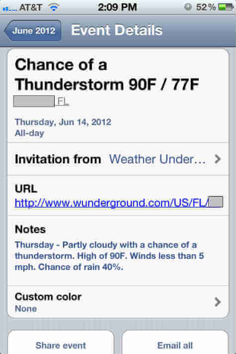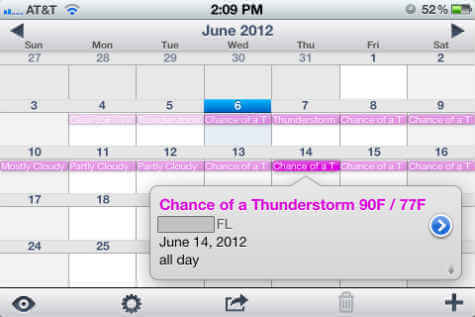 This is a quick note of your weather forecast and will be useful when you plan your next trip. Every week, this calendar will update to the next weekly forecast. A one-line-view of the weather in iCal probably won’t completely meet your needs for weather info, it does give a nice “at a glance” view of the upcoming weather, and you will get few more details while you tap on a particular day.